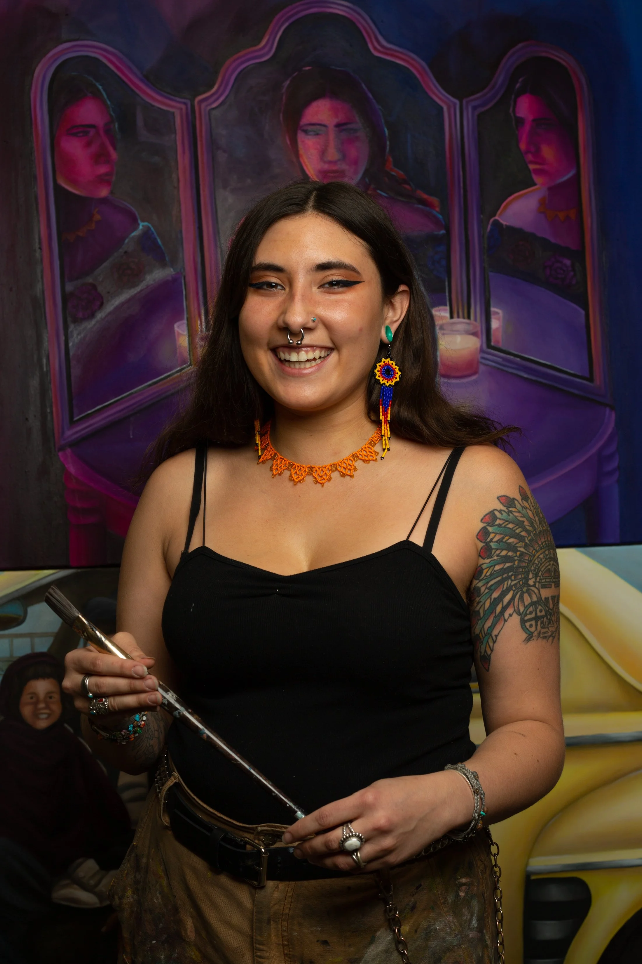 Cora Quiroz is a muralist and free dancer from Detroit Michigan. She has an Associate’s Degree in Graphic Design, and is currently studying a Bachelor’s of Fine Art Painting and Drawing at Arizona State University. Since she moved to Phoenix, she has worked with Roosevelt Row, Xico Inc, IndigenousCC, and Indigenous Design Collab. Cora’s artistic experience and life story is one worth knowing.